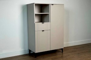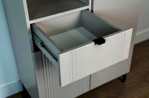 Дизайн комода продуман до мелочей: с одной стороны расположена глухая дверца, за которой скрывается просторное пространство для хранения. С другой стороны – ниша с открытой полкой, выкатной ящик и ещё одна глухая дверца, что позволяет гибко организовать хранение и поддерживать порядок в доме.